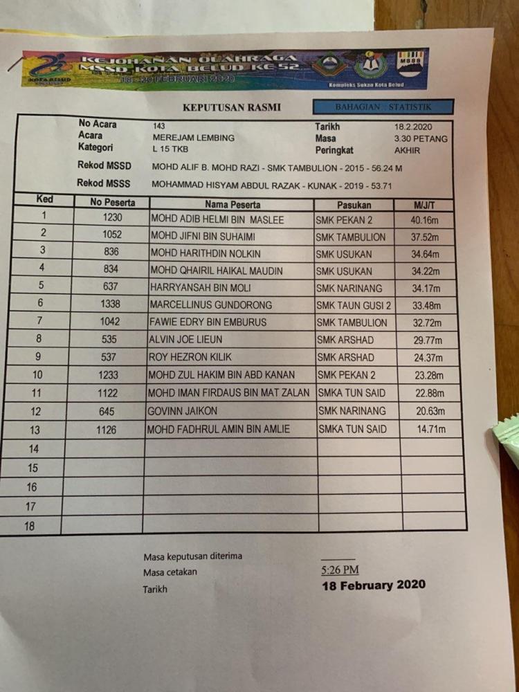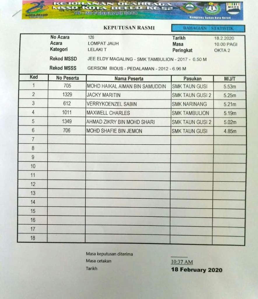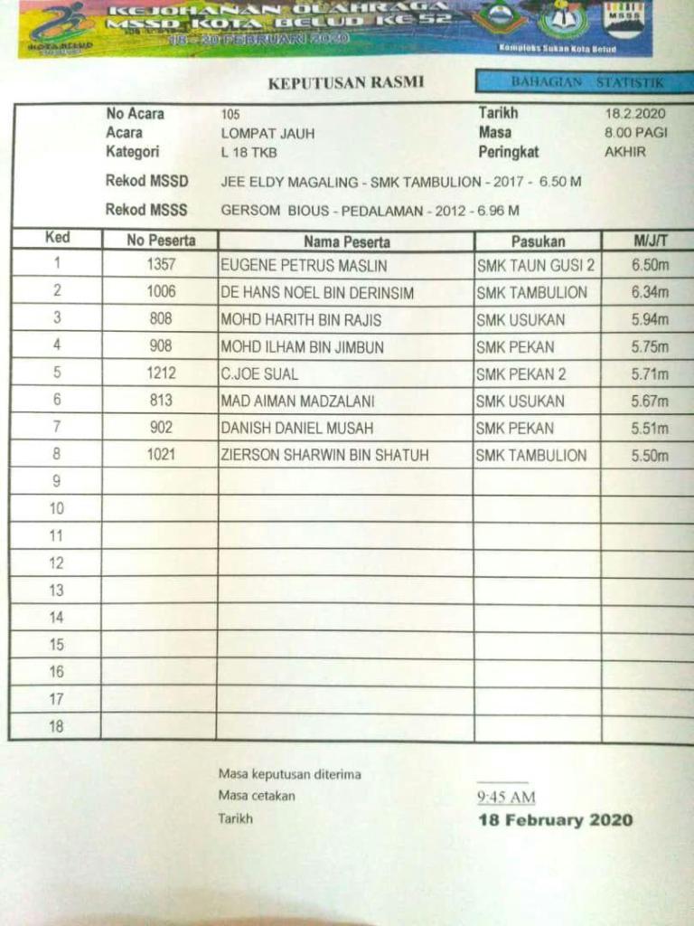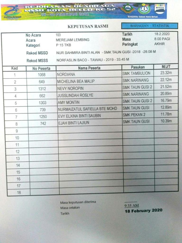 KEPUTUSAN RASMI HARI PERTAMA Posted byU-KbFebruary 18, 2020February 19, 2020Posted inUncategorized Acara 18.02.2020 ACARA 108 ACARA 103 Share this: Click to share on X (Opens in new window) X Click to share on Facebook (Opens in new window) Facebook Like Loading... Related